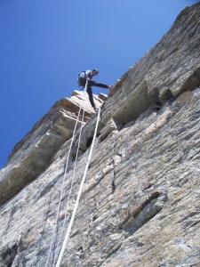 A mixture of down climbing and abseiling brought us to the enjambee below the shoulder. We had settled on a format of me leading every abseil and Steve following behind to untwist the ropes as he came down, hopefully preventing any rope jams.
