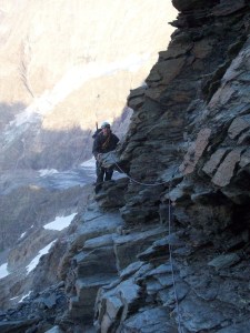 From Abruzzi Hut the route starts to wend it’s way steeper over rocks and scree fields until it reaches a steep gully that needs to be scrambled. It skirts a snow field on the flanks of Testa del Leone, until you arrive underneath the headwall. It then follows a line across the shattered and sometimes loose scree until you drop into the col between this mountain and The Matterhorn.