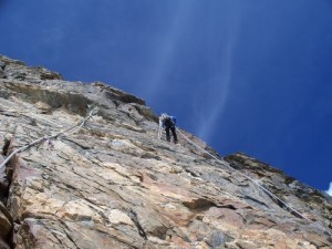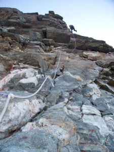 We were now back on the sunny side and the rock was warm and pleasant to the touch. The ropes lead to the Jordan Ladder which although overhangs slightly in the middle, was easy to climb. Another fixed rope on a traverse lead us to an easement and the easier last few metres to the Italian Summit. Steve was leading, but gallantly stopped short and offered me the last bit of leading to the summit. I was really touched by his gesture and readily agreed to go on ahead.
