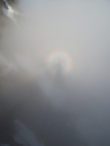 From watching the mountain during the week, we knew that thick cloud built up over the south face every afternoon. (We reckoned that the Swiss had put ‘fog pipes’ into the mountain and manufactured the clouds so that the Italian view was less visible than the Swiss view of the mountain!). In reality, it was caused by the cold air coming over the frozen north side of the shoulder, mixing with the warmer air that rose over the south face. The sun was getting lower on our right shoulder and as we crossed Pic Tyndall, our shadows were thrown onto the clouds and surrounded by halos to make ‘Brocken Spectres.’ They looked great and the photos don’t do them justice. Sometimes they had one halo, sometimes two and once even three!
