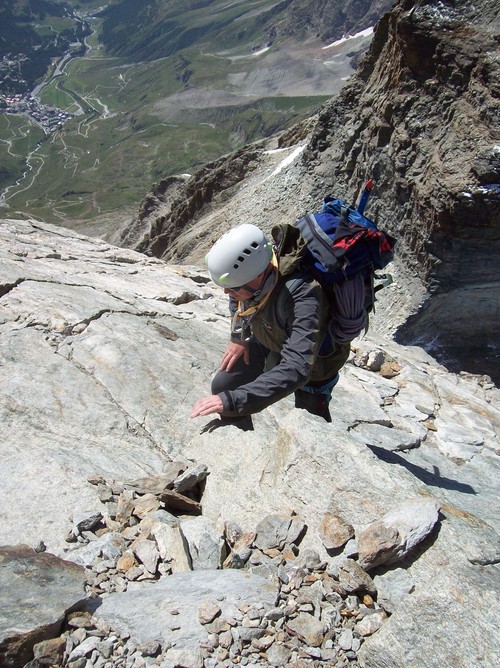 Nigel lewis on the slabs below Carel Hut, The Matterhorn.