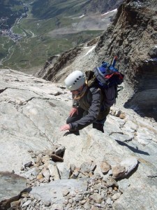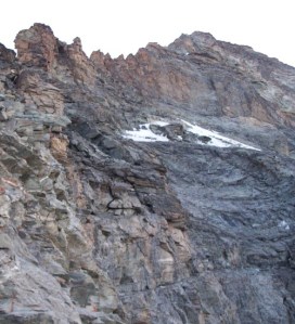 From Abruzzi Hut the route starts to wend it’s way steeper over rocks and scree fields until it reaches a steep gully that needs to be scrambled. It skirts a snow field on the flanks of Testa del Leone, until you arrive underneath the headwall. It then follows a line across the shattered and sometimes loose scree until you drop into the col between this mountain and The Matterhorn.
