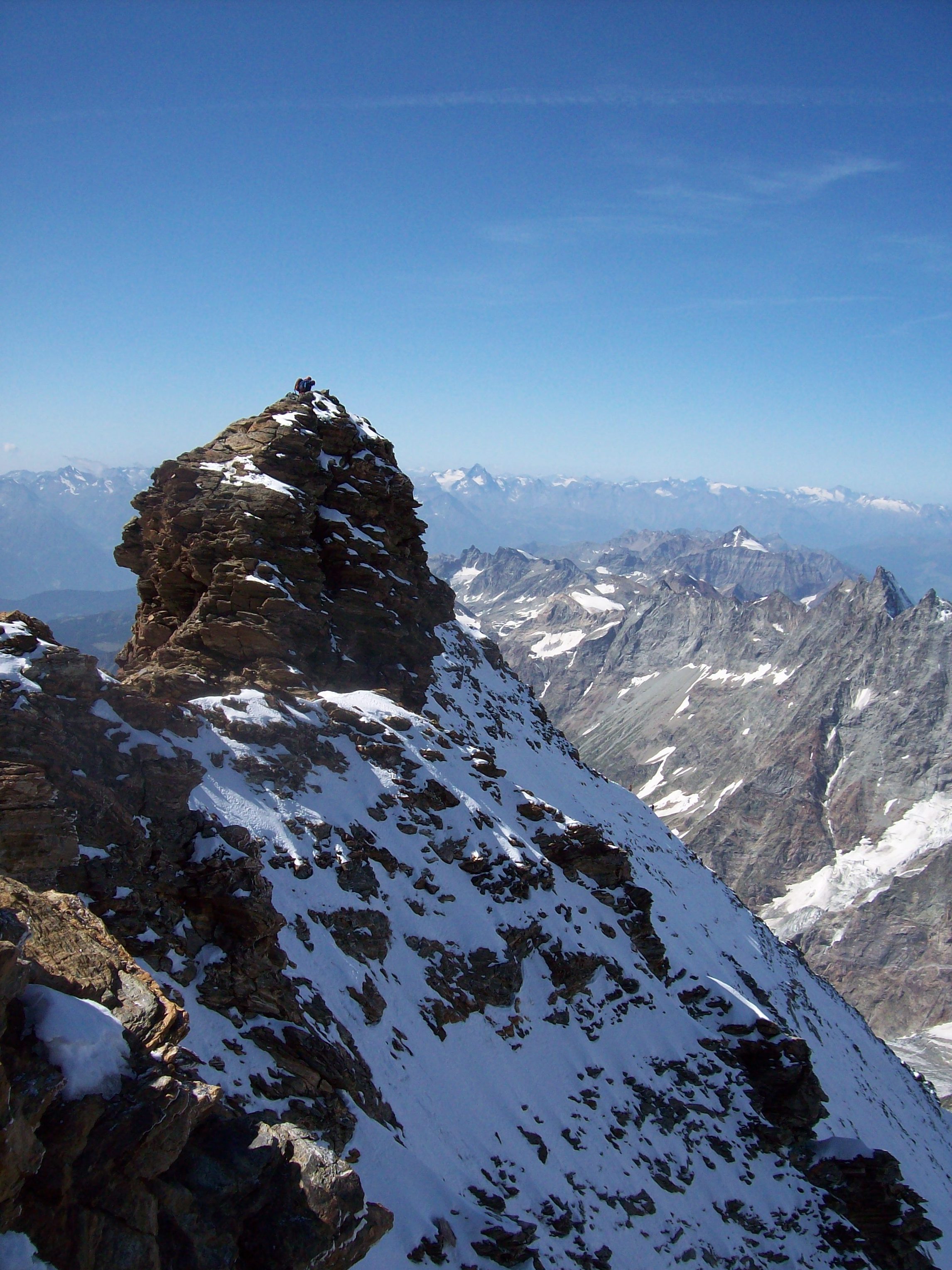 We were now back on the sunny side and the rock was warm and pleasant to the touch. The ropes lead to the Jordan Ladder which although overhangs slightly in the middle, was easy to climb. Another fixed rope on a traverse lead us to an easement and the easier last few metres to the Italian Summit. Steve was leading, but gallantly stopped short and offered me the last bit of leading to the summit. I was really touched by his gesture and readily agreed to go on ahead.