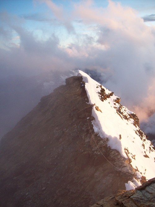Steve joined me and we sat in the sun for a while enjoying the view over our late lunch. We debated continuing on and down the Hornli ridge, but decided against it as we had no route description with us. The plan had always been to descend via The Italian ridge and that was what we should do. We figured it would add an extra hour or two to reach the Swiss summit and get back here, so decided we had done what we set out to do and it was now time to race the sunset and get back.