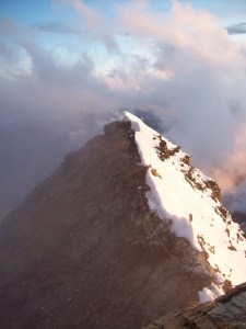 From watching the mountain during the week, we knew that thick cloud built up over the south face every afternoon. (We reckoned that the Swiss had put ‘fog pipes’ into the mountain and manufactured the clouds so that the Italian view was less visible than the Swiss view of the mountain!). In reality, it was caused by the cold air coming over the frozen north side of the shoulder, mixing with the warmer air that rose over the south face. The sun was getting lower on our right shoulder and as we crossed Pic Tyndall, our shadows were thrown onto the clouds and surrounded by halos to make ‘Brocken Spectres.’ They looked great and the photos don’t do them justice. Sometimes they had one halo, sometimes two and once even three!